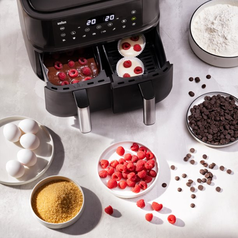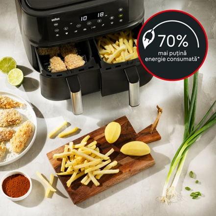 Friteuza cu aer cald, fara ulei, Braun TwinCook 3 TD3030IBK, 2850W, 8 L (4L + 4L), tehnologie RealAir, 8 programe automate, temperatura ajustabila, timer, ecran digital, oprire automata, negru