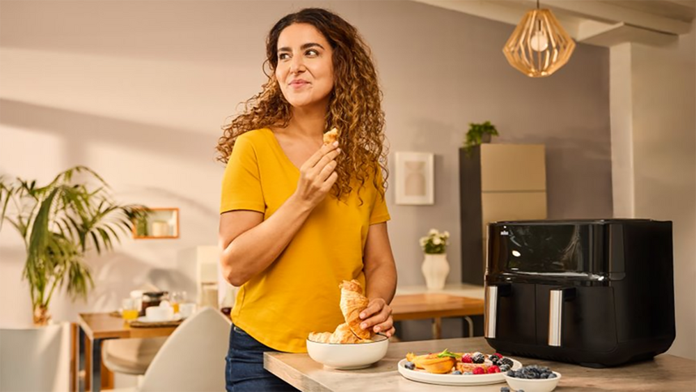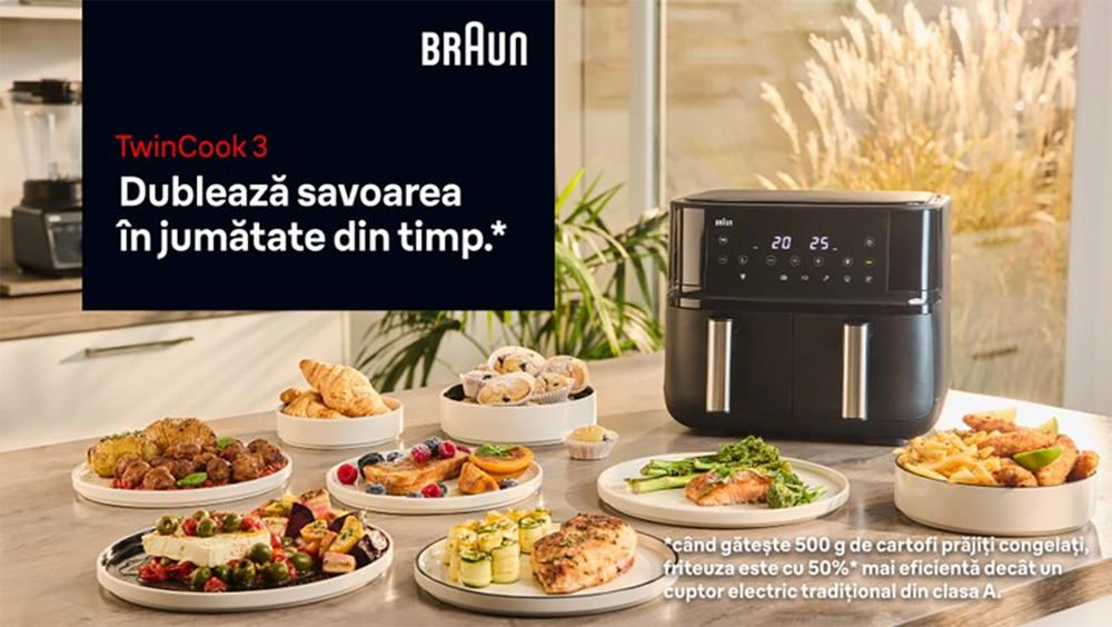 Performanta, diverse feluri de mancare, timp castigat? Cu TwinCook 3, toate beneficiile pe care ti le doresti sunt la dublu. Ai parte atat de posibilitatea de a gati simultan specialitatile preferate ale familiei, datorita functiei Sync si capacitatii totale de 8 L, cat si de tehnologia RealAir care garanteaza ca preparatele tale vor fi exact asa cum ti le imaginezi. Pe scurt, te asteapta o experienta culinara de doua ori mai savuroasa.