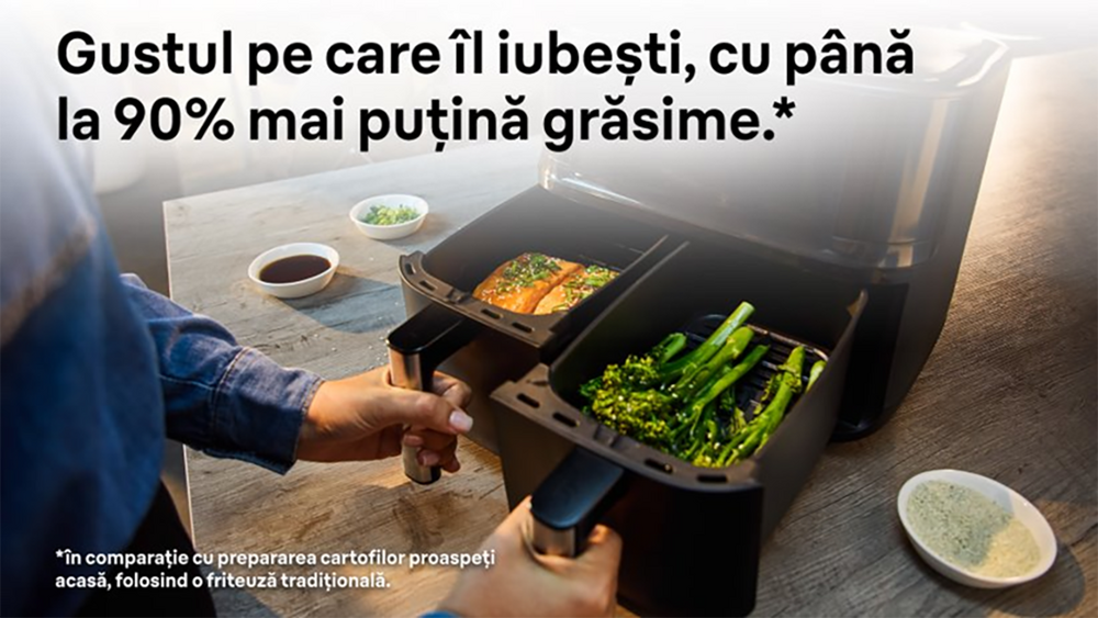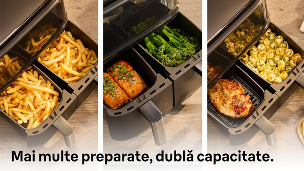 Cele doua sertare, fiecare de 4 L, iti vor oferi spatii generoase pentru a pregati diverse gustari sau mese intregi. Vei putea gati un pui intreg de 1,4 kg intr-un sertar, in timp ce in celalalt prepari 0,9 kg de cartofi prajiti sau legume. Practic, aceasta capacitate dubla va fi ideala pentru familia ta pofticioasa.