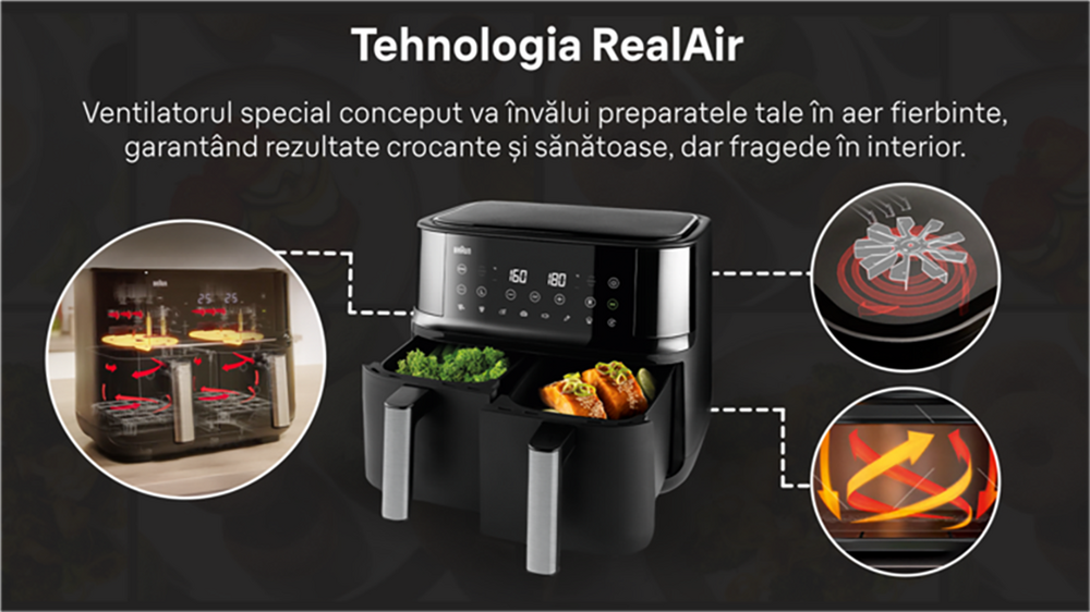 Datorita tehnologiei RealAir, te vei putea bucura din plin de felurile de mancare si deserturile favorite, fara regrete si cu foarte putin sau chiar deloc ulei.