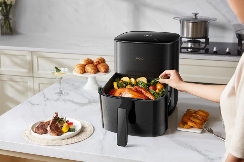 MOVA AeroChef FD10 Pro este o friteuză cu aer cald modernă, concepută pentru gătit sănătos, eficient și fără ulei. Este ideală pentru familii sau pentru cei care doresc să reducă grăsimile din alimentație fără a renunța la gustul crocant al preparatelor prăjite. Cu o capacitate generoasă de 6 litri și o putere de 1800W, aparatul oferă performanțe excelente în prepararea rapidă a unei varietăți de mâncăruri.