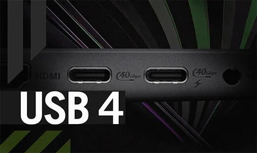Cand trebuie sa te conectezi la ecranul mare, GPU-ul dedicat alimenteaza un port HDMI 2.1 pentru cele mai recente televizoare si monitoare, crescand latimea de banda totala de la 18 la 48Gbps si suportand continut de pana la 4K 120Hz si 8K 60Hz. Doua porturi USB4 Type-C permit o multime de conectivitate - pentru DisplayPort si unul pentru livrarea energiei.