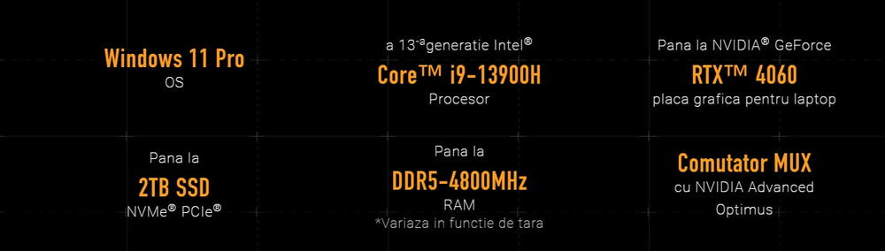 | Caracteristici cheie | Tastatura iluminata Touchpad care accepta gesturi de atingeri multiple Camera WEB Ecran cu tehnologie G-sync MUX Switch + NVIDIA® Advanced Optimus Backlit Chiclet Keyboard 1-Zone RGB Placa grafica: 2195Mhz at 65W (2145MHz Boost Clock+50MHz OC, 50W+15W Dynamic Boost) |